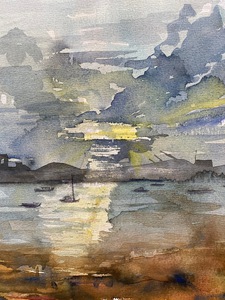 Een aquarel landschap in blauw en oker, ingelijst op houten paneel.